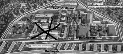 - Direkt vor dem Hauptseingang zu stehen, ist wenig sinnvoll. Dort ist nur die Verwaltung. Von der Rochusstraße auf betrachtet sind dann rechts davon U-Haft-Häuser der Männer, ganz rechts außen ist ein U-Haft Haus der Frauen. Links vom Eingang sind Strafhafthäuser der Frauen. Die Architektur in Ossendorf behindert die Möglichkeit der Kontaktaufnahme zwischen drinnen und draußen sehr. Trotzdem sollten wir es versuchen.